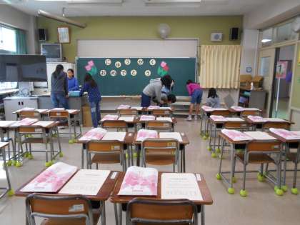 明日の始業式・入学式に向けて6年生がいろいろ準備をしてくれました。2年生は入学式の歓迎の出し物の練習をしました。校庭の桜の花も散らずに可愛い1年生の入学を待っています。