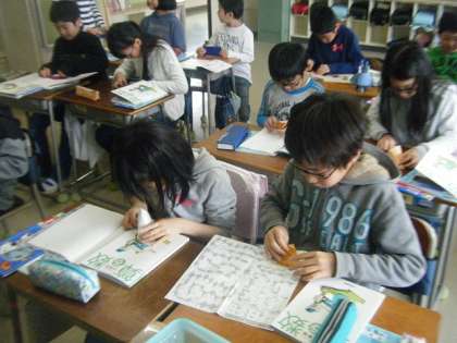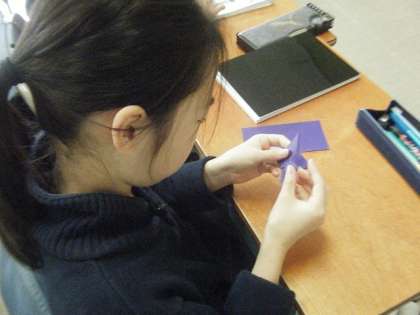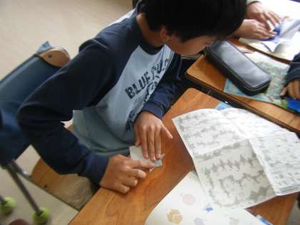 「どんどんコース」では、線対称の図形の特徴を見つけるために実際に折り紙を折る作業を取り入れました。