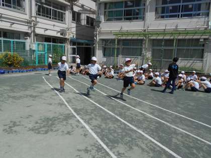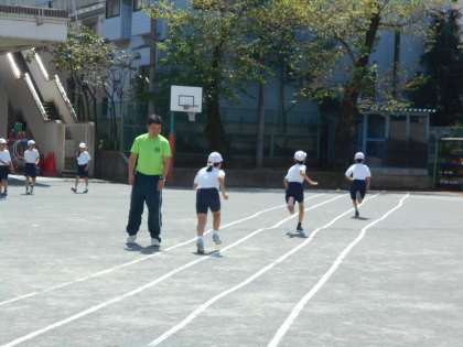 校庭に伸びた白いライン。その上を5年生は懸命に走ります。4年生のときより、タイムがよくなったと嬉しそうな顔をみせてくれました。