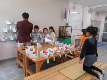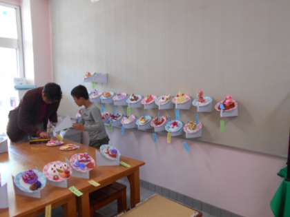 玄関が素敵なケーキ屋さんに早変わりしました。3年生が図工の時間に紙粘土で思い思いの作品を作りました。テーマは、「ケーキを召し上がれ」です。23日の土曜授業日に保護者の皆様にもご覧いただきたいと思います。