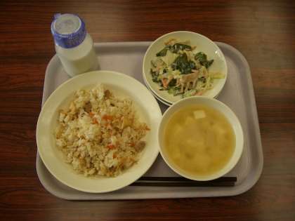 今日の献立は、こぎつねご飯、牛乳、味噌汁、たけのこサラダです。