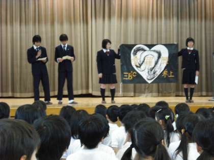 今朝の九品仏小学校の児童朝会に、八幡中学校の生徒会の皆さんが参加しました。