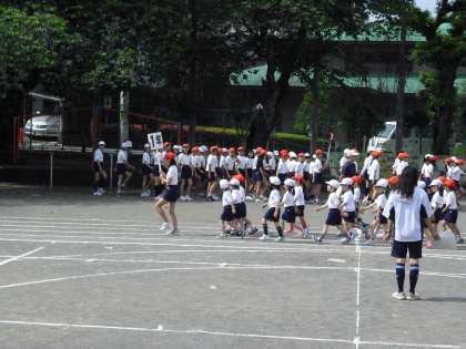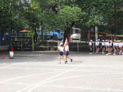 今日は、1時間目に“全校練習”がありました。画面は、応援団長を先頭に入場行進をしているところです。