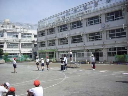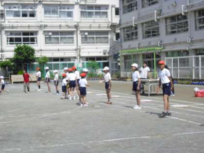 画面は、“縦割班 競技の練習”風景です。