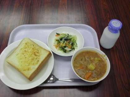 今日の献立は、ガーリックトースト、牛乳、ビーンズシュチューなどです。