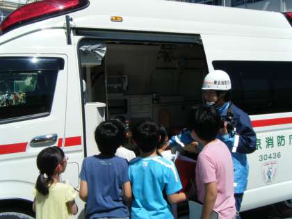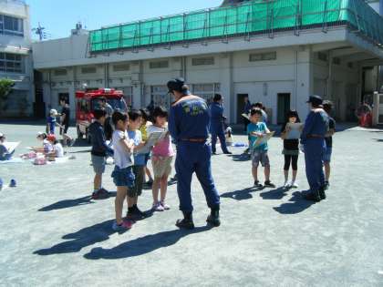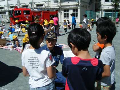 消防写生会のために来てくださった消防署・消防団の方々に、社会科「消ぼうの仕事と人々の協力」の学習でさらに知りたくなったことを伺いました。