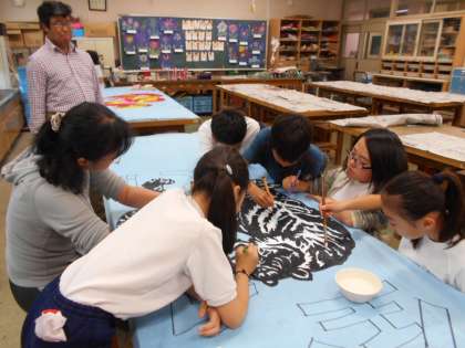 28日の運動会に向けて、図工・漫画クラブはみんなで協力して旗を作成しています。初めての試みで仕上がりが楽しみです。