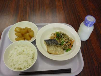 今日の献立は、ごはん、牛乳、ジャガイモの甘辛煮、魚の塩焼き、和風サラダです。