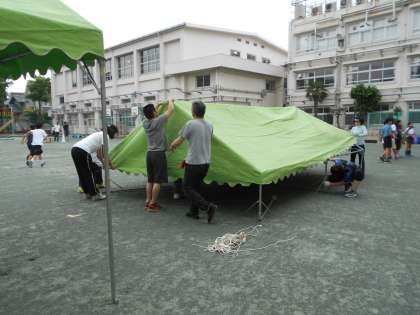 朝からの雨も上がり、5・6年生は運動会の前日準備に取り組みました。九品仏商店会の皆さんもテント張りに駆けつけてくださいました。明日の運動会には、多くの皆様のご来校をお待ちしています。