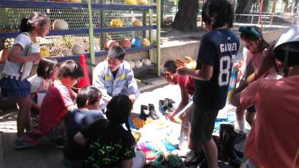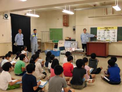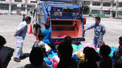 玉川清掃事務所の方々に来校していただき、「ごみ減量はなぜ必要?ごみや資源のゆくえはどうなっているのだろう?」をテーマに、環境学習を行いました。校庭で、中の見える清掃車(体験学習用ごみ収集車「カティ」)を見学・操作体験をしました。視聴覚室では、ごみの種類や処理のゆくえ、資源のリサイクルの流れ、3Rの言葉と意味をパネルを見たりDVDを鑑賞したりして説明を受けました。