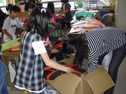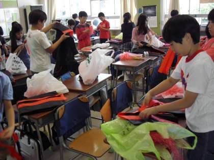 4年生の教室では、運動会で使用した衣装の後片付け・・・きちんとたたんで、先生に渡し箱に入れていました。