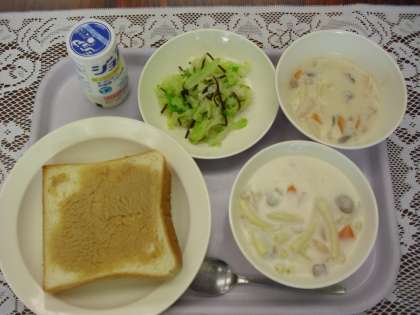 今日の献立は、きな粉バタートースト、乳酸飲料、マカロニのクリーム煮、キャベツの塩コンブかけです。今日もアレルギー対応食を作りました。
