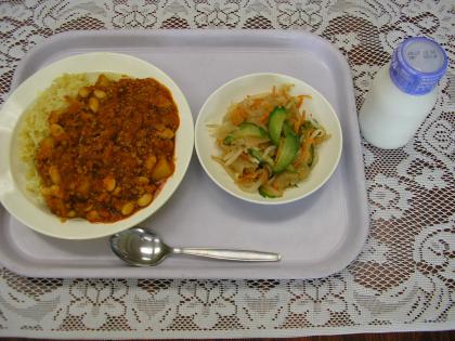 今日のメニューは、チリビーンズライス、牛乳、こんにゃくサラダです。また、今日は、7,8月の「誕生日給食」の日です。ランチルームで7,8月生まれの子ども、教職員 そして、校長、給食主任、栄養士で楽しくいただきました。