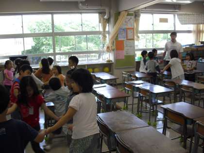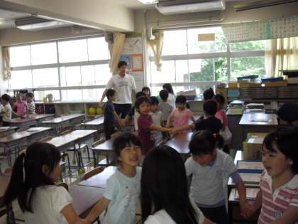 1年生の教室では、“おはよう あくしゅ”の歌で、一日がスタート・・・先生とクラスの友達と楽しく1日が始まります。