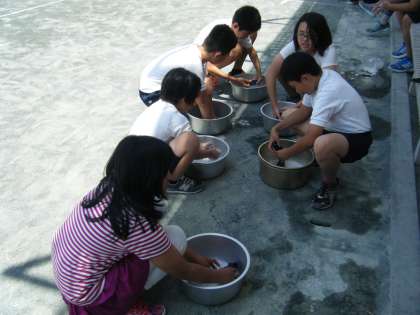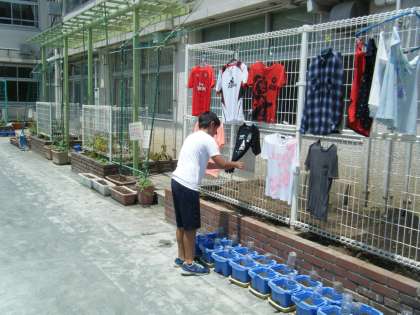晴天の中、3.4時間目に自分のTシャツと靴下を洗濯しました。子どもたちは首回りや脇の下など汚れやすい部分を念入りにもみ洗いしました。絞る作業が一番難しかったようですが、「乾いたものを持って帰りたい!!」と意気込み、一生懸命絞りました。