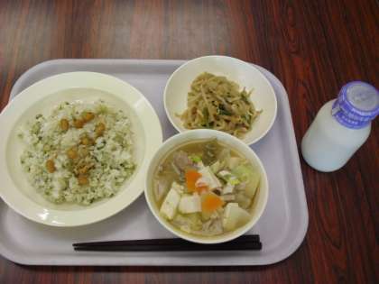 今日の献立は、豆ご飯、牛乳、豚汁、やさいのごま酢かけです。