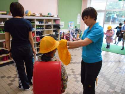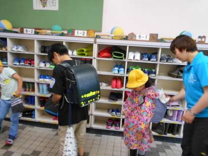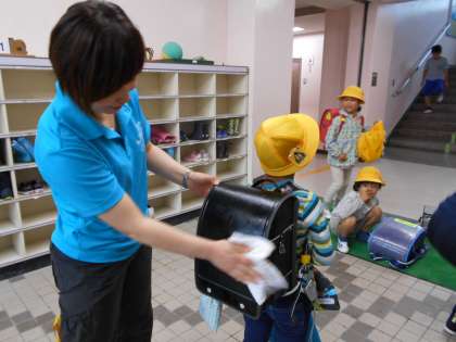 梅雨に入り、傘が手放せない頃となりました。今朝は雨脚が強く、濡れて登校する子が多かったです。1年生の担任は、タオルをもち玄関で出迎えます。1年生でなくとも子どもたちのランドセルを拭いていました。