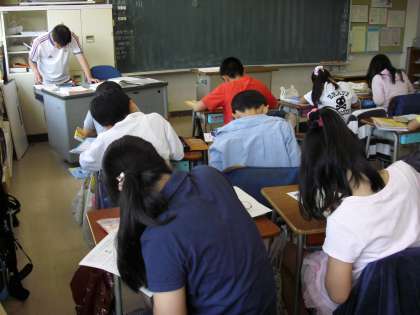 5年生の教室では、“算数科:少人数指導”画面は、担任の授業です。練習問題を各自が取り組んでいる場面です。