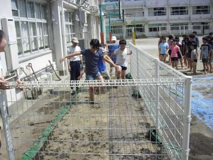 画面は、みんなで協力して、田に水を入れているところです。そのあと、田んぼに入り、田んぼつくり・・・。