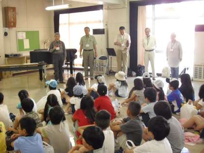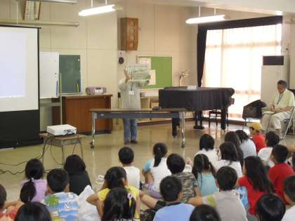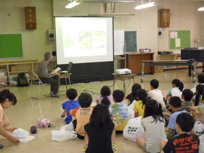 3・4年生は、ゲストティチャーを招いて、“ヤゴとり体験学習”をしました。ゲストティチャーの紹介・・・パソコンで詳しい説明・・・“トンボの一生”の紙芝居などを受けてから、プールサイドへ・・・。