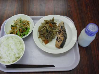 今日の献立は、ごはん、牛乳、かみかみきんぴら、魚の南部焼き、おしたしです。