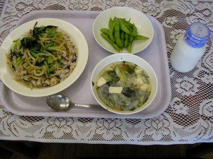 今日のメニューは、ビビンバ、牛乳、わかめスープ、枝豆です。