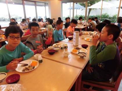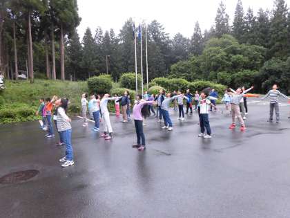 川場の朝は小雨です。でも、元気な顔がそろい、朝会では 代表が登山の決意を披露しました。朝食の準備も素早くできました。