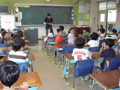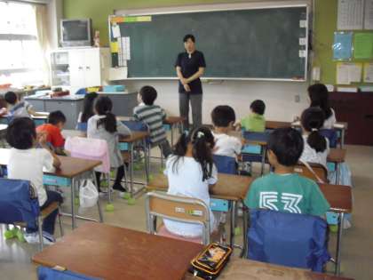 2年生の教室では、“朝の会”出席調べの際に、健康状況と子どもの好きな場所を発表していました。健康観察の後、“梅雨時の健康”について子どもにできることをわかりやすく指導していました。