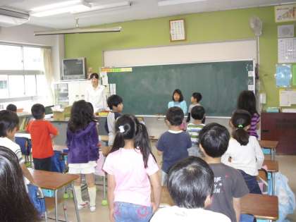 2年生の教室では、朝の会がはじまり、あいさつを元気にしていました。
