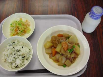 今日の献立は、わかめご飯、牛乳、肉じゃがうま煮、ひと塩やさいです。