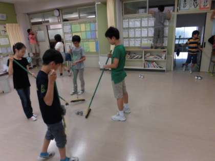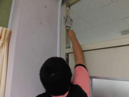 高いところは、棒に雑巾を巻き付けてほこりをとるなどの工夫をして、教室を隅々まできれいにしました。
