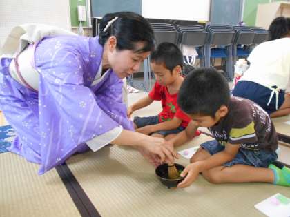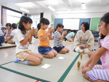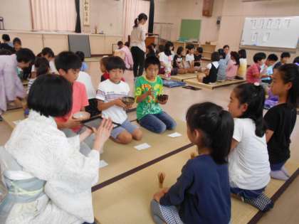 大田区立池雪小学校PTAのOBの皆さんを中心とする「茶道キャラバン」が今年も来てくださいました。今日の茶道教室には80名を超える参加がありました。茶道教室2回目は低学年と6年生です。1年生もきちんと正座をして、お茶をたてたり、作法を学んだりしました。