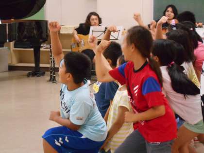今回は川平さんの仲間のバンドの方4人も応援に来てくださり、子どもたちの動きに合わせて音色を奏でていただきました。レッスンが進むにつれ、テンションが上がり、動きにもキレが出てきました。3時20分から保護者の方に作品を披露しました。