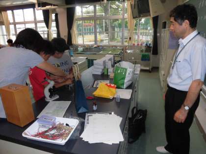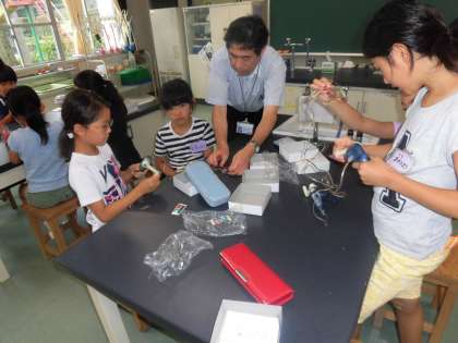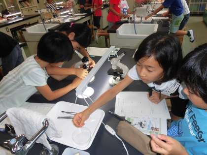 低学年はモーターを使って発電について学び、高学年は顕微鏡を使った細胞の観察をしました。