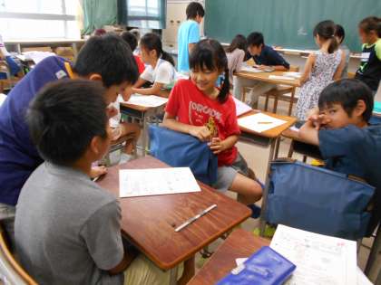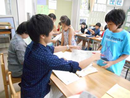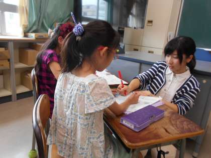 4年生も意欲的に算数のプリントに取り組んでいます。わからない問題は先生やボランティアの方が丁寧に教えています。