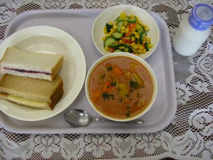 今日のメニューは、二色サンド、牛乳、トマトシチュー、トロピカルサラダです。