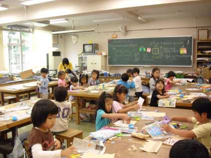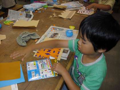 1年生は、“図工の授業”折り紙を切って、紙袋のにはっていました。色遣いや形にさまざまな工夫がみられました。
