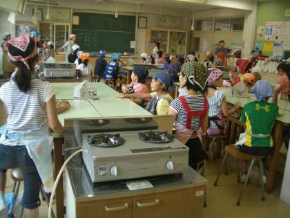 本校の東校長先生と学習支援コーディネーターの方々が講師となって料理教室を行いました。メニューは夏野菜カレーで、お米をとぐところから始めました。違う学年の友達同士で班を編成したため、上の学年の児童がリーダーシップを発揮して、話し合いを進めたり、作業を進める姿が見られました。