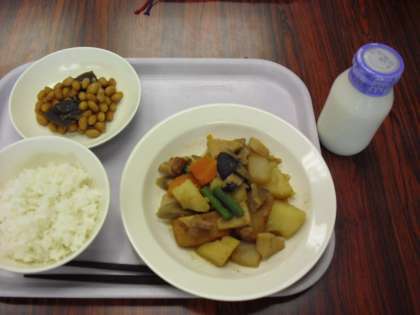 今日の献立は、ご飯、牛乳、炒りぢり煮、塩ナムルです。