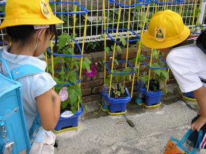 一年生の育てているあさがおの花が咲き始めました。今朝はいくつ花を咲かせているかなぁ。と、子どもたちは朝の登校時にながめています。