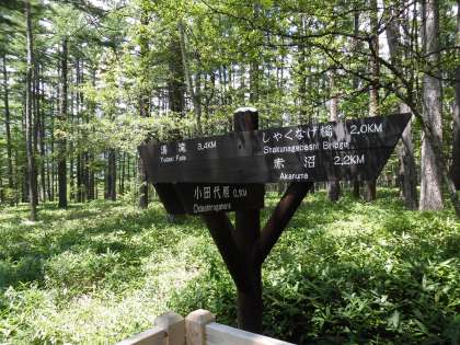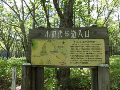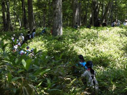 小田代ヶ原からしゃくなげ橋までは、大笹と巨木の林の中を一列になって進みます。途中、野生動物除けの回転扉がありました。私たち人間が動物の森にお邪魔していることを忘れてはいけないと子どもたちに話しました。