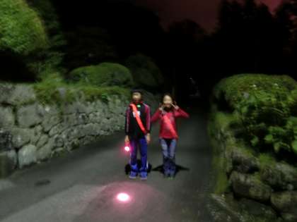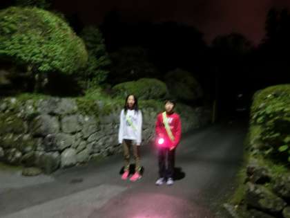 懐中電灯をもち反射のたすきをかけ、宿舎のまわりを巡る肝試しをしました。恐いかなと話しながら、ペアになった友達と暗闇の中に消えていきました。
