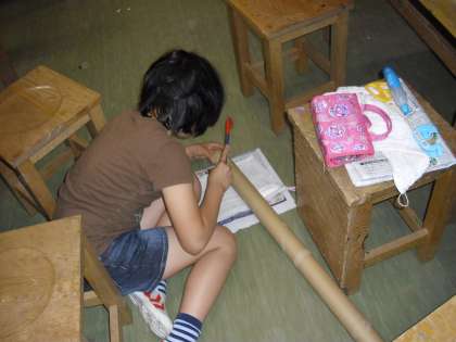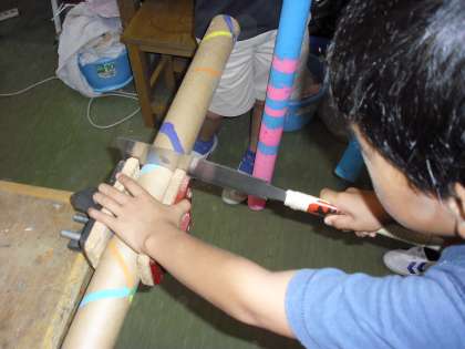 4年生は、“図工の学習の時間”・・・長い筒を切ったり、たたいたりして、作品を作っているところです。先生の説明を聞いてから始めました。