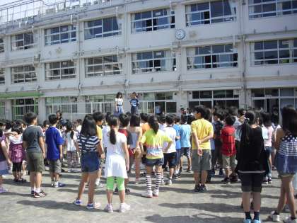 今朝、“児童集会”があり、“猛獣狩りに行こうよ!”という遊びを全校でしました。集会員の子どもが・・・“猛獣狩りに行こうよ!鉄砲だって持ってるし、槍だって持ってるもん・・あっ・・○○”と動物などの言葉を言い、その数のグループを作る遊びです。