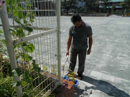 日直の先生の仕事の中で、植物の水やりは朝一番の仕事です。最近、天気が安定し雨が降らないので、水をたっぷりとあげています。