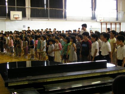 1学期最後の音楽集会が開かれました。「ゆかいに歩けば〜」と子どもたちもピアノ伴奏に乗って楽しく歌いました。
