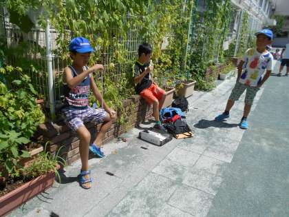 理科の学習で育てている植物を夏休みも観察を続けています。3年生はホウセンカ、4年生はツルレイシ(ゴーヤ)です。友達と一緒の観察は楽しそうです。
