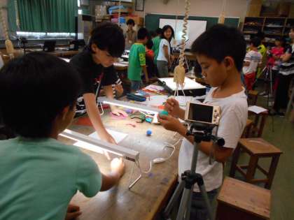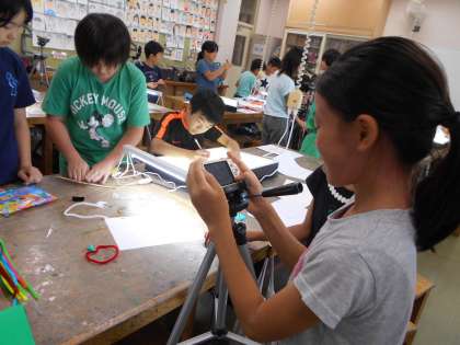 サマースクールの最後の講座はアニメーション教室です。首都大学東京の今間先生がコマ撮りで動画を作成することを教えてくださいます。子どもたちはチームワークよく楽しく活動しています。2日目の30日は作品を仕上げていきます。