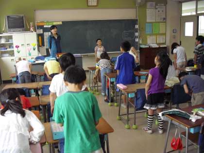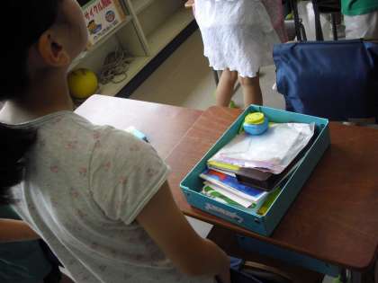 2年生の教室では、朝の会を・・・日直さんも大はりきりでした。朝の会の前に、机の中の道具箱の整理をしていました。