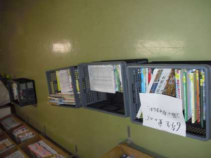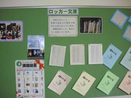 画面は、ロッカー文庫についての図書室前の掲示と学年別に分けた本です。